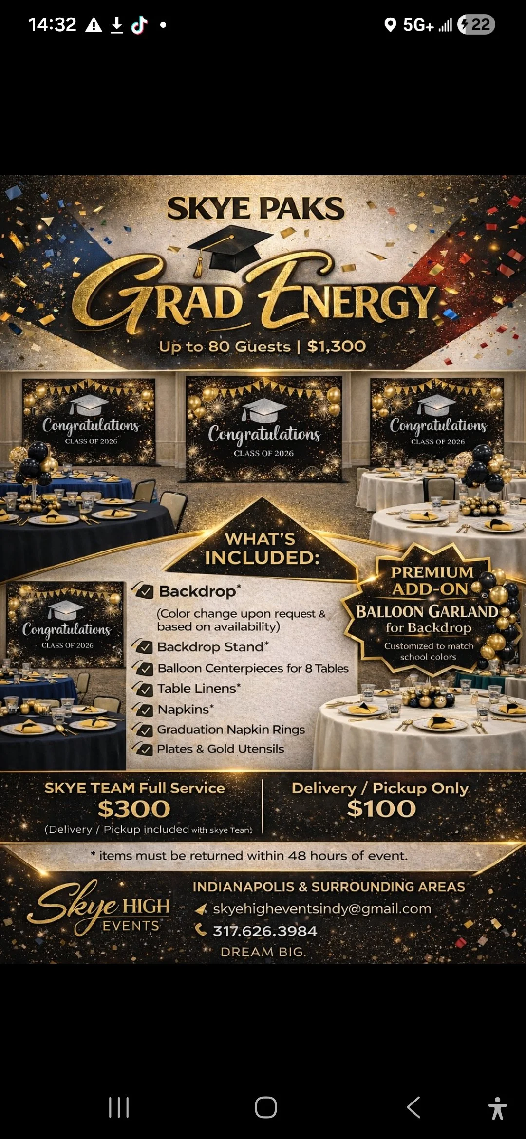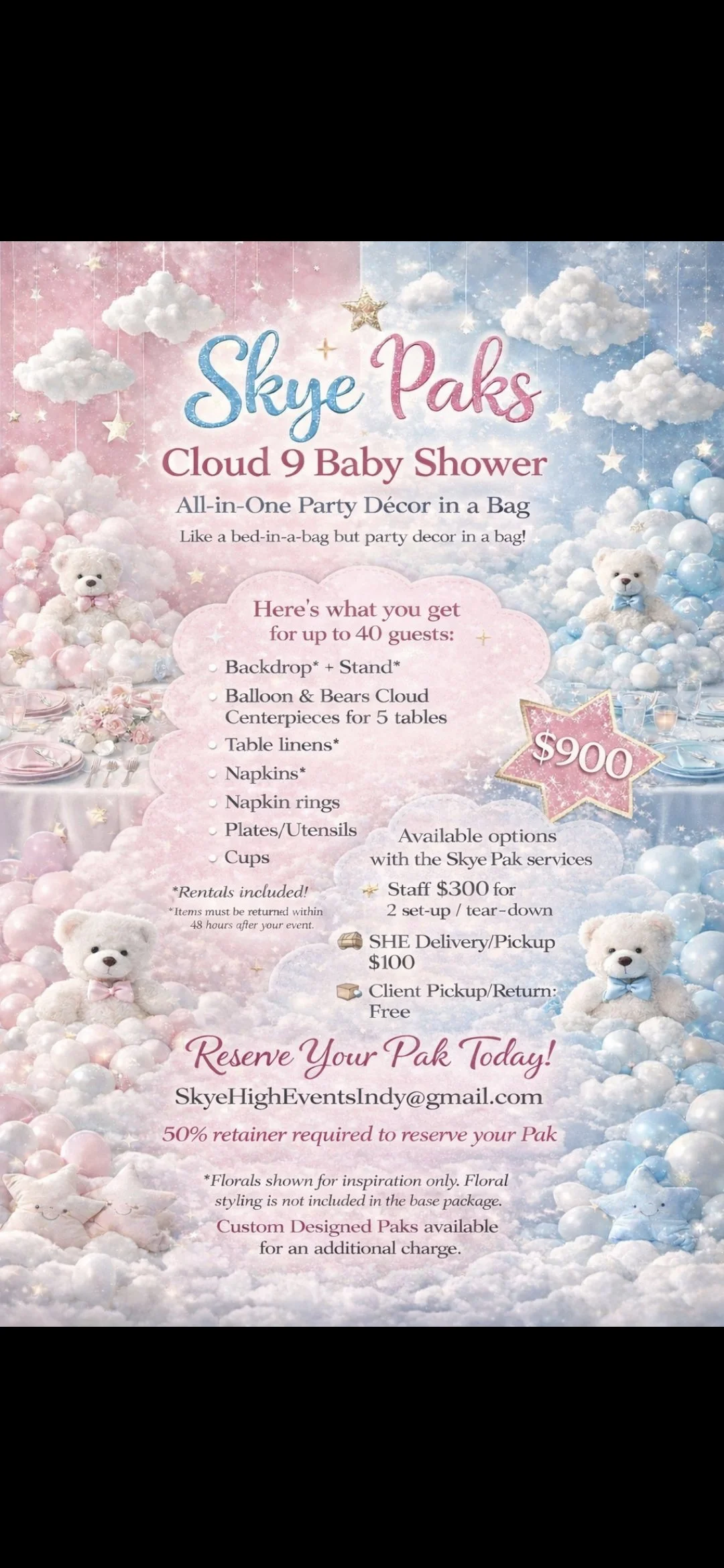 SKYE PAKS Store 1 Balloon Garland Add-On $350.00 Add To Cart Added! SKYE PAKS - Grad Energy! $1,300.00 Add To Cart Added! Skye Paks Delivery & Pick-up $100.00 Add To Cart Added! Skye Paks Full Service (includes delivery) $300.00 Add To Cart Added! Skye Paks - Cloud 9 Blue $900.00 Add To Cart Added! Skye Paks - Cloud 9 Pink $900.00 Add To Cart Added! Have Questions?SkyeHighEventsIndy@gmail.com 317.626.3984